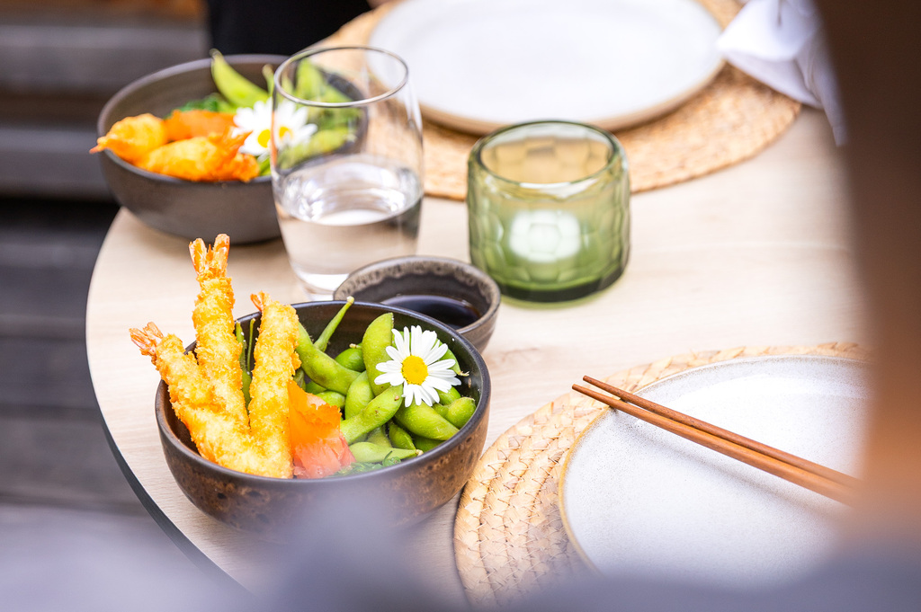 Geniessen Sie eine bunte Bowl mit frittierten Shrimps, Lachs, Algensalat und Edamame, dazu 18 Sushi-Rollen in sechs verschiedenen Sorten und zum Dessert drei süsse Sushi-Rollen.